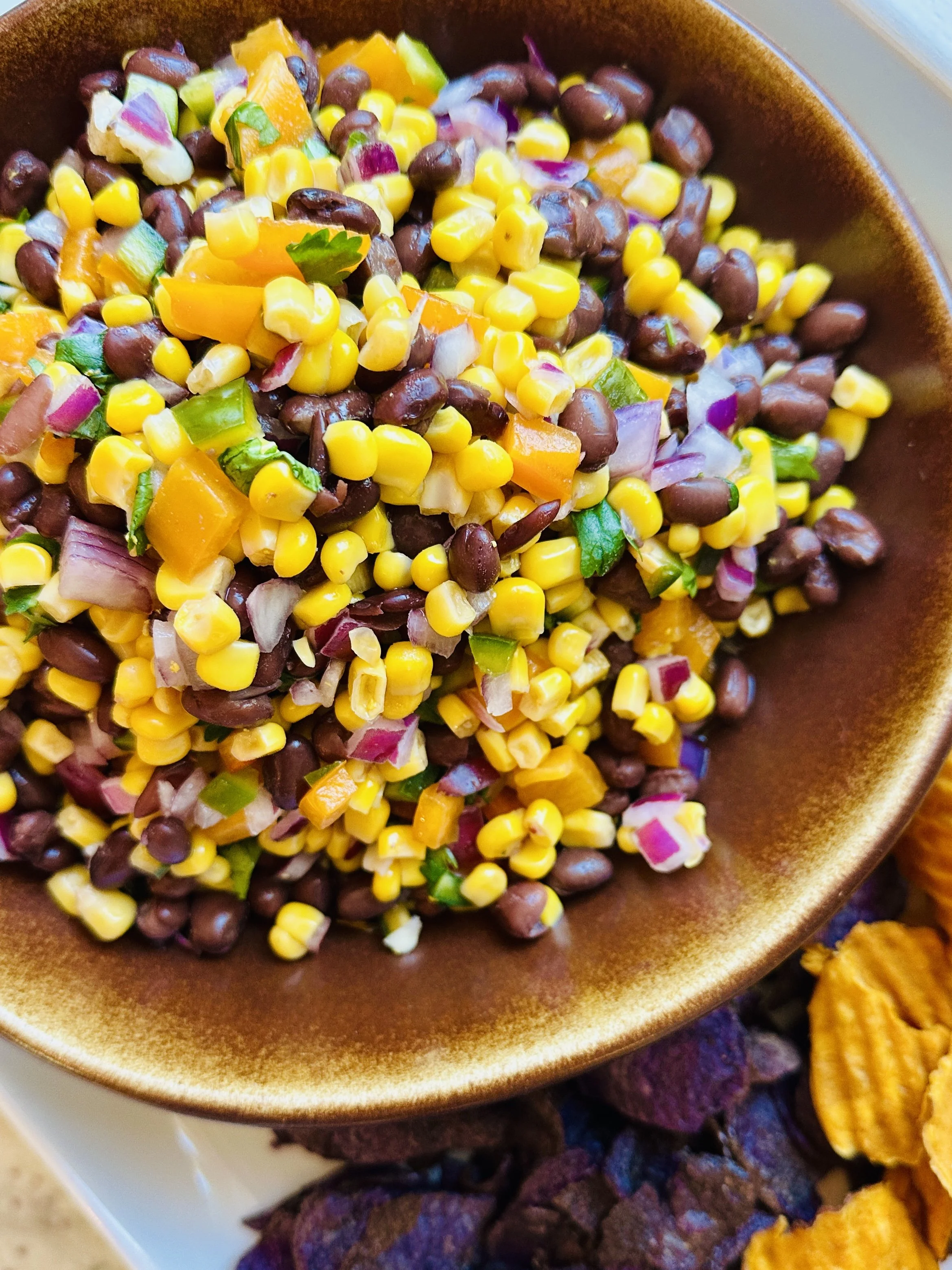 In a large bowl, combine black beans, corn, red and orange bell peppers, onion, jalapeño, and cilantro.